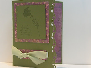 This week's challenge is sponsored by StampTV and the prize is two of Gina's stamp sets. I used Gina K designs card stock fresh asparagus and dp by Basic Grey Green at Heart. The stamps I used are from the sets Elegant Flowers and Friends, also by Gina. I used my punch on the front edge of the card and the inside dp shows through. Sorry that I couldn't get it to stand where the picture was at a better angle. I used the dp on the inside and then layered a piece of white card stock for my message. I am going to give this to one of my best friends that has been one of my biggest supporters for the last couple of years and is always there for me.